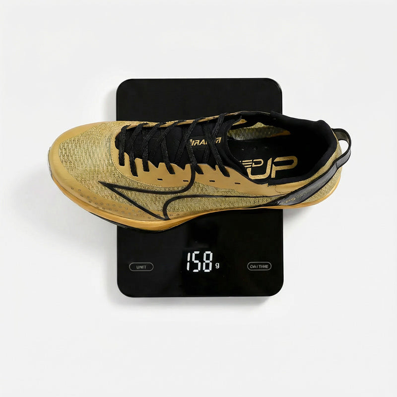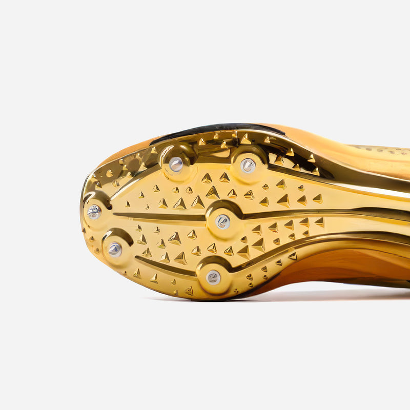 The Hyper Carbon CP5 Gold sprint spikes featuring a full length carbon fiber plate enhancing energy return and increasing foot speed on the track. The lightweight design comes in at only 158g and the shoe utilizes cutting edge materials like HiFoam and carbon fiber technology for maximum performance. Limited gold edition model.